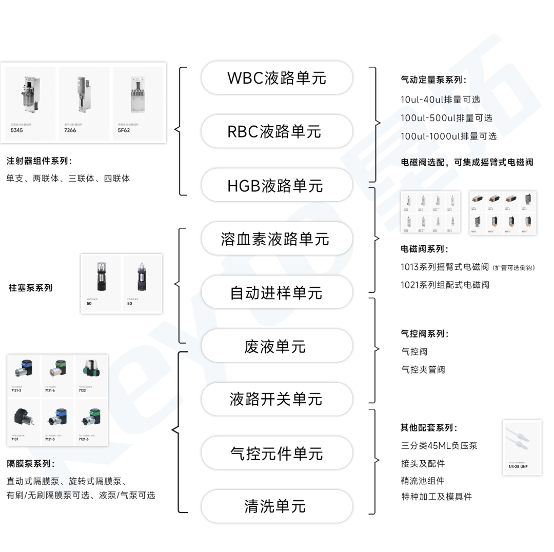 以一款體外診斷常見的全自動血液分析流水線中的血液細胞液路分析系統(tǒng)為例,為大家進行簡化模擬選型,下圖僅限學習參考,以實際應用為準,如有相關需求可與我司銷售人員咨詢,依據(jù)您的儀器進行專屬化選型適配。