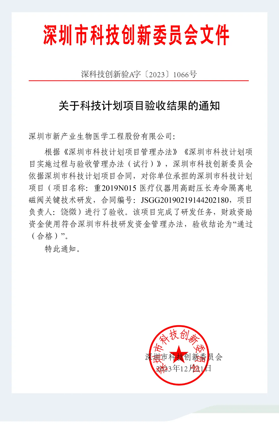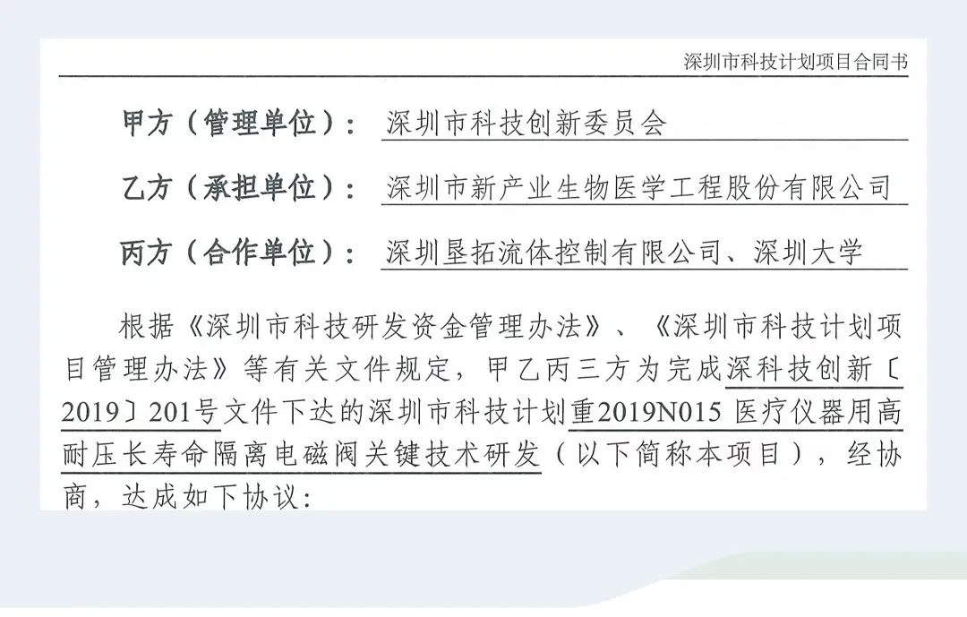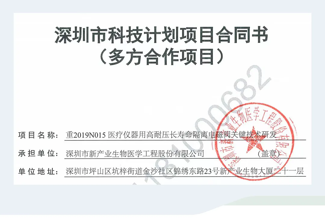 近期,深圳市新產(chǎn)業(yè)生物攜手墾拓流體、深圳大學(xué),共同完成了一項(xiàng)由深圳市科技創(chuàng)新委員會發(fā)起的醫(yī)療儀器用高耐壓長壽命隔離電磁閥關(guān)鍵技術(shù)研發(fā)項(xiàng)目(項(xiàng)目編號:2019N015)。