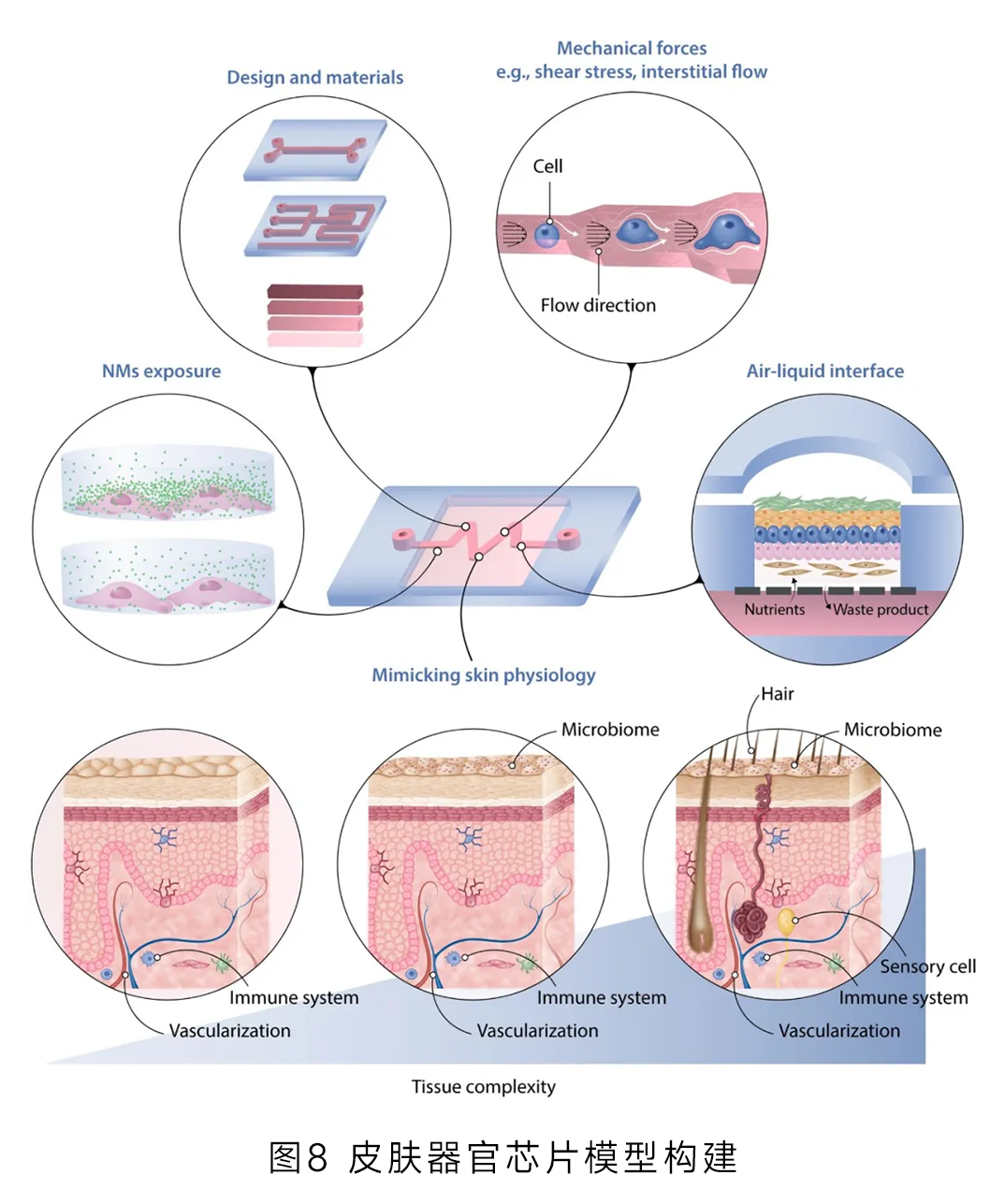 皮膚器官芯片由多種細(xì)胞和細(xì)胞外基質(zhì)構(gòu)建,高度還原真實(shí)皮膚組織(圖8);這一替代不僅避免了動物實(shí)驗(yàn)倫理爭議,還提供了更精準(zhǔn)、更具生理相關(guān)性的測試結(jié)果,以更科學(xué)、更人道的方式評估產(chǎn)品功效與安全性,推動行業(yè)朝著綠色、可持續(xù)方向發(fā)展。
