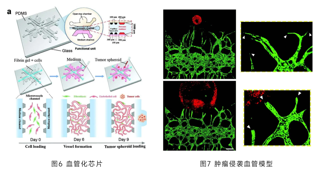 微流控技術(shù)作為一種前沿技術(shù),能夠在微小的通道內(nèi)精確操控流體,為模擬生物體內(nèi)微環(huán)境提供了有力手段;而血管化芯片則可構(gòu)建出具有血管結(jié)構(gòu)的微環(huán)境(圖6)。將兩者結(jié)合用于研究腫瘤侵蝕血管時(shí),首先在微流控芯片上精心構(gòu)建出包含血管結(jié)構(gòu)的三維微環(huán)境,通過精確控制流體,模擬體內(nèi)血液循環(huán)。接著將腫瘤細(xì)胞引入該微環(huán)境中,觀察腫瘤細(xì)胞在血管化芯片上的生長、遷移以及與血管相互作用的過程(圖7)。