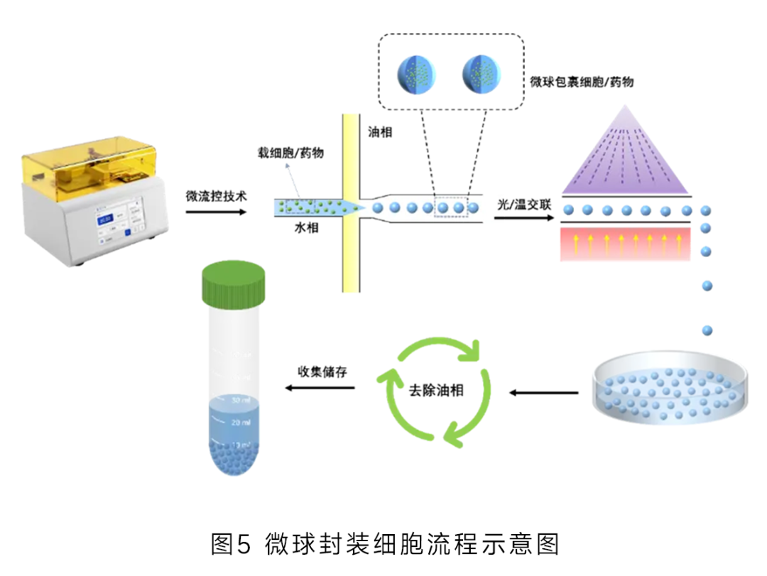 基于微流控芯片內(nèi)部的微通道網(wǎng)絡(luò),利用流體力學(xué)原理,將含有細(xì)胞的生物溶液與用于形成微球的材料溶液(如聚合物溶液、水凝膠)在微通道中精確操控和混合。通過調(diào)節(jié)微通道的尺寸、流體流速等參數(shù),使兩種溶液在特定位置形成微小的液滴或微球結(jié)構(gòu),細(xì)胞被包裹在這些微球內(nèi)部,隨后經(jīng)過物理或化學(xué)方法使微球固化成型,從而實(shí)現(xiàn)細(xì)胞的穩(wěn)定包裹 (圖5)。